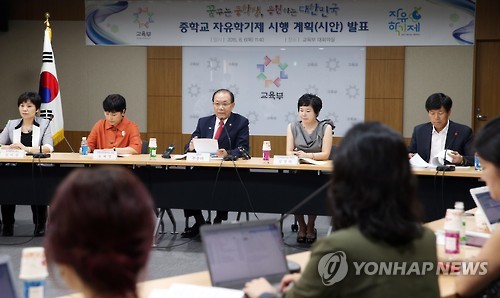 | △ 출입기자단 간담회 갖는 황우여 부총리 (서울=연합뉴스) 황우여 사회부총리 겸 교육부 장관이 6일 정부세종청사에서 출입기자단 오찬 간담회를 갖고 있다. 황 부총리는 이날 2016년부터 자유학기제를 전면 시행하기 위한 '중학교 자유학기제 시행 계획' 시안을 발표했다. (교육부 제공) |