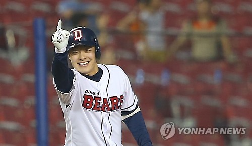 | △ 민병헌 '이거야!' (서울=연합뉴스) 김도훈 기자 = 6일 오후 서울 잠실야구장에서 열린 2015 프로야구 넥센 히어로즈와 두산 베어스 경기. 4회말 1사 만루 두산 민병헌이 싹쓸이 3루타를 쳐낸 뒤 기뻐하고 있다. 2015.8.6 superdoo82@yna.co.kr |