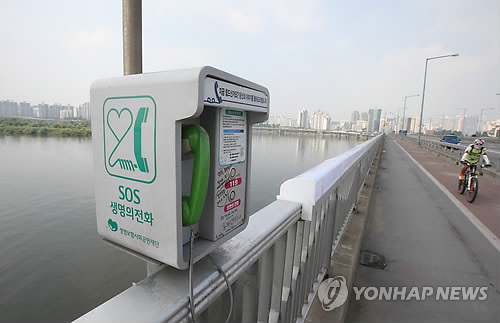 | △ 서울시는 한강다리의 투신사고 방지 시설에 대한 아이디어를 공모한다고 7일 밝혔다. 사진은 마포대교에 설치된 생명의 전화. (연합뉴스 자료사진) |