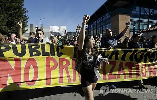 | △ 지난해 11월 미국 캘리포니아주립대학(UC) 이사회가 향후 5년간 수업료를 매년 5% 인상키로 의결하자 버클리 캘리포니아대(UC 버클리) 학생들이 수업을 거부한 채 항의 시위를 벌이고 있는 모습(자료사진) |
