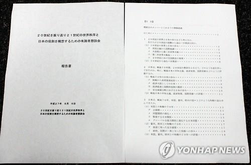 (도쿄=연합뉴스) 조준형 특파원 = 아베 신조(安倍晋三) 일본 총리의 전후 70년 담화(아베 담화)와 관련한 전문가 자문기구의 보고서는 한국과 중국에 대해 현격히 다른 시선을 투영했다는 평가가 제기됐다.