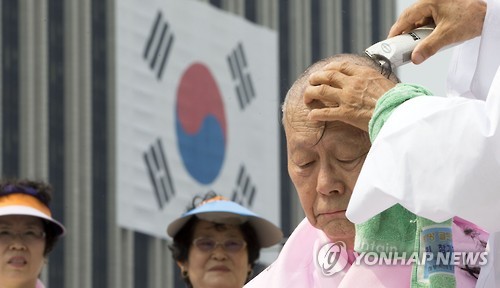 (서울=연합뉴스) 권영전 기자 = 일제 강제동원 피해자 유족들이 강제동원 피해자 보상법 통과와 과거 한일협정 당시 보상금 지급, 일본의 사죄를 요구하며 삭발식을 했다.