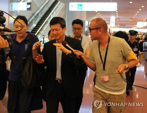 | △ 신동주 일본 입국…향후 행보는 (도쿄=연합뉴스) 이세원 특파원 = 후계 경영권을 둘러싸고 신동빈 롯데그룹 회장과 대립 중인 신동주 전 일본 롯데홀딩스 부회장이 7일 도쿄(東京) 하네다(羽田)공항으로 일본에 입국했다. 도착 출구로 나오며 취재진에 둘러싸인 신동주. |