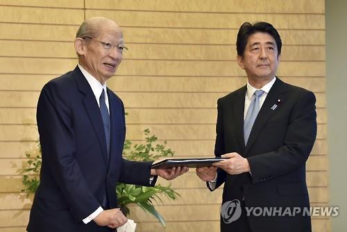 | △ '20세기를 돌아보고 21세기의 세계 질서와 일본의 역할을 구상하기 위한 유식자 간담회'(21세기 구상 간담회)의 좌장인 니시무로 다이조(西室泰三) 닛폰유세이(日本郵政) 사장으로부터 전후 70년 담화(일명 아베 담화)에 관한 보고서를 받는 아베 신조(오른쪽) 일본 총리(AP=연합뉴스) |