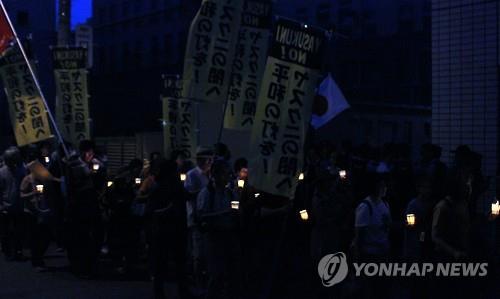 (도쿄=연합뉴스) 이세원 특파원 = 한국과 일본의 시민단체가 일본의 패전 70주년을 앞두고 일본 야스쿠니(靖國)신사 주변에서 참배 반대 등을 요구하는 촛불 시위를 벌였다.