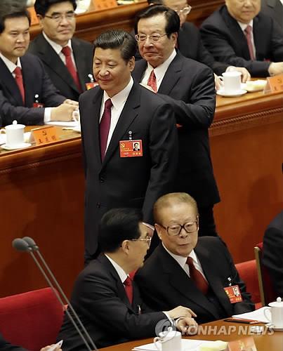 | △ 2012년 11월 베이징 인민대회당에서 열린 공산당 제18차 전국대표대회(당대회)에서 엇갈리는 시진핑 국가주석과 후진타오(아래 왼쪽), 장쩌민(아래 오른쪽) 전 국가주석의 모습. 당시 당대회로 시진핑 체제가 공식 출범했다. 2015.8.10 (AP=연합뉴스 DB) |