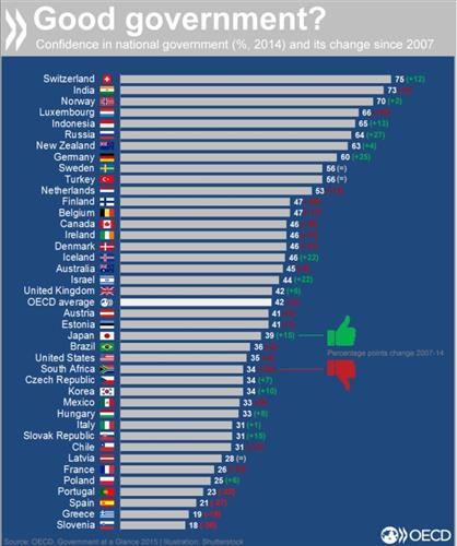 OECD 회원국의 정부 신뢰도는 2007년 평균 45.2%에서 2014년 41.8%로 3.3% 포인트 떨어졌다.