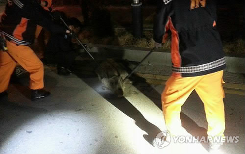 | △ 의정부 도심에 나타난 멧돼지 (의정부=연합뉴스) 최근 경기 북부 지역에서 도심에 멧돼지가 잇따라 나타나 시민을 놀라게 하고 있다. 사진은 10일 오전 0시께 의정부시 의정부소방서 앞에서 택시와 충돌한 멧돼지를 소방관들이 제압하는 모습.2015.4.10<<의정부소방서>> jhch793@yna.co.kr |