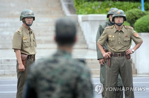 | △ 남측 주시하는 북한 병사 (판문점=연합뉴스) 임병식 기자 = 24일 판문점에서 북측 병사가 한국전쟁 유엔군 참전용사 일행을 살펴보고 있다. 2015.7.24 andphotodo@yna.co.kr |