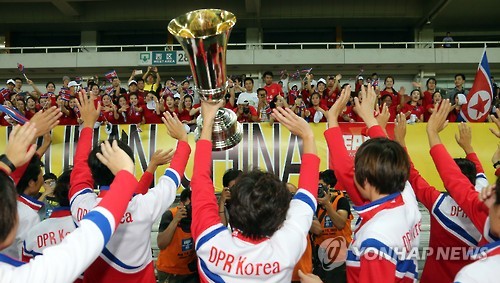 북한 여자축구 대표팀은 전날 중국 우한 스포츠센터에서 열린 남한과의 동아시안컵 3차전에서 2-0으로 승리하며 지난 대회에 이어 2회 연속 우승컵을 안았다.