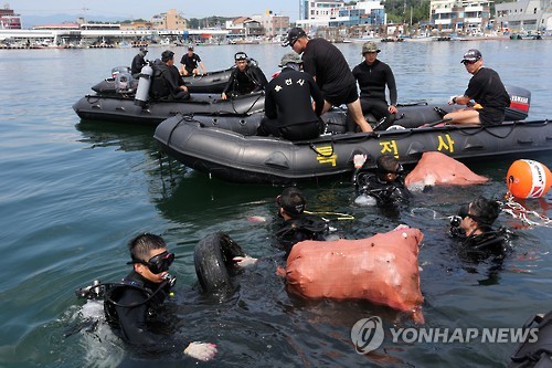 | △ 특수전교육단, 강릉 사천항 수중정화 (강릉=연합뉴스) 유형재 기자 = 막바지 피서가 한창인 가운데 특수전교육단 해상척후조 교육생 100여 명이 9일 휴일도 반납한 채 강릉시 사천면 사천항에서 수중정화활동을 벌이고 있다. 특수전교육단의 사천항 수중활동을 올해로 12년째로 이날 쓰레기 60마대, 폐타이어 18개, 기타 생활 폐기물 등 2t가량의 쓰레기를 수거했다.2015.8.9 yoo21@yna.co.kr |