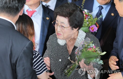 | △ 꽃다발 받는 이희호 여사 (서울=연합뉴스) 이정훈 기자 = 3박 4일간의 방북 일정을 마친 이희호 여사가 8일 오후 김포공항을 통해 귀국, 환영객들로 부터 꽃다발을 받고 있다. |