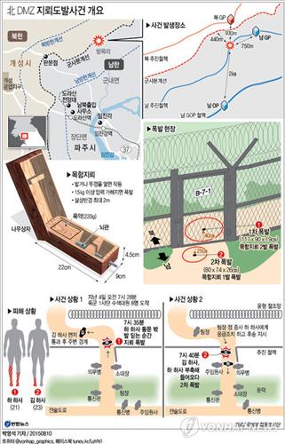 (서울=연합뉴스) 이영재 기자 = 지난 4일 경기도 파주 비무장지대(DMZ)에서 발생한 지뢰폭발사고는 북한군이 군사분계선(MDL)을 넘어와 매설한 목함지뢰가 터진 것으로 조사됐다.