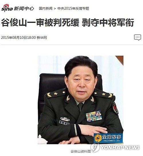 | △ 사형 선고받은 중국 '군 부패 몸통' 구쥔산 (서울=연합뉴스) '군 부패의 몸통'으로 중국 당국에 체포돼 조사중이던 구쥔산(谷俊山) 전 중국 인민해방군 총후근부 부부장이 10일 사형유예 2년을 선고받았다. 구쥔산이 부정부패로 축적한 재산은 300억 위안(약 5조 4천억 원)에 달하는 것으로 알려졌다. (중국 지나뉴스 화면 캡쳐) |