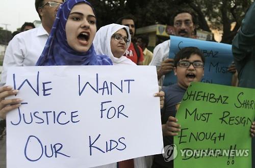 | △ 9일 파키스탄 라호르에서 시민단체 회원들이 아동 성범죄자 처벌을 촉구하는 시위를 하고 있다.(AP=연합뉴스) |