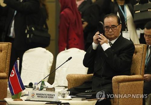 | △ 지난 6일 말레이시아 쿠알라룸푸르에서 열린 아세안지역안보포럼(ARF) 외교장관회의에 참석한 리수용 북한 외무상.(EPA=연합뉴스) |