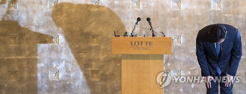 | △ 사과 인사하는 신동빈 회장 (서울=연합뉴스) 윤동진 기자 = 롯데그룹 신동빈 회장이 11일 오전 서울 중구 롯데호텔에서 최근 붉어진 경영권 분쟁과 관련해 대국민 사과를 하고 있다. |