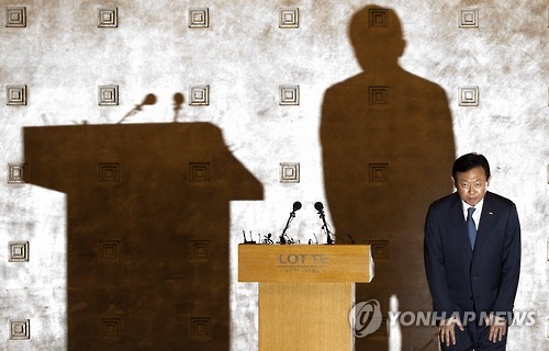 | △ 사과 인사하는 신동빈 회장 (서울=연합뉴스) 윤동진 기자 = 롯데그룹 신동빈 회장이 11일 오전 서울 중구 롯데호텔에서 최근 붉어진 경영권 분쟁과 관련해 대국민 사과를 하고 있다. |