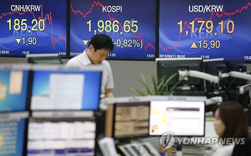 | △ 위안화 평가 절하, 원화 통화 급락 (서울=연합뉴스) 황광모 기자 = 11일 오후 서울 명동 외환은행 본점 딜링룸에 이날 코스피 지수와 원·달러 환율, 원 ·위엔화 환율이 표시 돼 있다. 중국의 위안화 평가절하 조처에 한국을 포함한 아시아 주요국 통화 가치가 일제히 급락세를 나타냈다. 코스피는 전날대비 0.82& 하락한 1,986.65를 기록했으며 코스닥 지수는 1.89% 떨어진 732.26을 기록했다. |