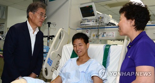| △ 지뢰폭발 부상장병 위문하는 문재인 대표 (성남 국회 사진기자단=연합뉴스) 새정치민주연합 문재인 대표가 11일 오후 경기도 성남시 국군수도병원 중환자실을 찾아 비무장지대(DMZ)내에서 북한이 설치한 것으로 추정되는 목함지뢰 폭발로 부상한 김 하사를 위로 방문하고 있다. |