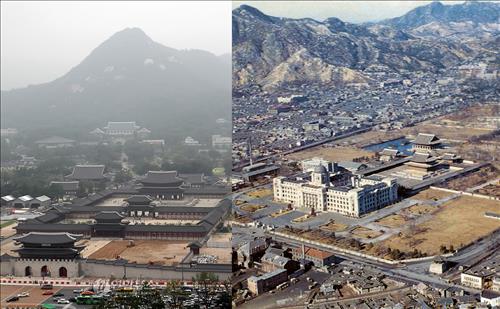 | △ 경복궁은 일제강점기 수많은 전각이 훼철됐다. 왼쪽 사진은 광화문이 복원된 2010년에 촬영됐고, 오른쪽 사진은 1951년에 찍혔다. 1951년 사진에는 근정전 앞에 총독부 청사가 버티고 있다. (연합뉴스 자료사진, 문화재청 제공) |
