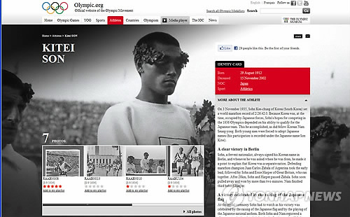 | △ 지난 2011년 IOC는 손기정 선생의 약력을 바로잡아 달라는 대한체육회(KOC)의 요청을 일부 받아들여 홈페이지 선수 소개란에 '손기정(Sohn Kee-Chung)'이 일본식 이름인 '키테이 손(Kitei Son)'으로 표기된 시대적 배경 등을 자세하게 설명한 자료를 올렸다. (연합뉴스 자료사진) |