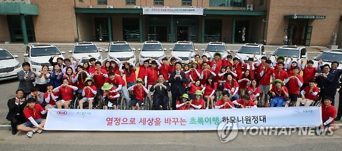 | △ 기아차 '초록여행 하모니 원정대 3기' 발대식 (서울=연합뉴스) 12일 경기도 김포 효원문화센터에서 열린 '초록여행 하모니원정대 3기 발대식'에서 김승진 기아차 전무, 김선규 사단법인그린라이트 회장 등 참가 대학생들이 기념촬영을 하고 있다. 초록여행 하모니원정대는 장애인 대학생 2명, 일반인 대학생 3명이 팀을 이뤄 6박 7일간 카니발 이지무브 차량을 타고 국내를 여행하면서 장애인 편의 시설을 점검하는 사업이다. (기아차 제공) |