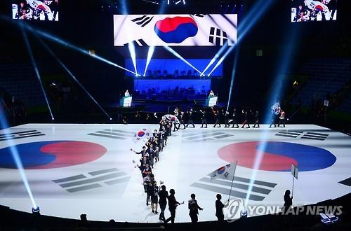 | △ (상파울루=연합뉴스) 김재순 통신원 = 11일(현지시간) 브라질 상파울루 이비라푸에라 스타디움에서 열린 제43회 국제기능올림픽대회 개막식에서 한국 선수단이 입장하고 있다. 개막식에는 대회 관계자와 각국 선수단, 브라질 정·재계 인사 등 8천여 명이 참석했다. 남미 대륙에서 처음으로 열리는 이번 대회에는 세계 59개국 1천190여 명의 선수가 참가했다. 41개 직종에 45명의 선수들이 출전하는 한국은 19번째 종합우승과 대회 5연패 달성을 노리고 있다. 2015.8.12 |