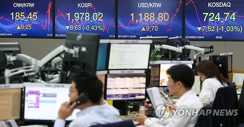 | △ 위안화 평가절하 여진…코스피 약보합 (서울=연합뉴스) 한종찬 기자 = 코스피가 12일 중국 위안화 평가절하의 여파가 이어지며 약보합 흐름을 나타냈다. 코스피는 이날 오전 10시 전날보다 5.08포인트(0.26%) 하락한 1,981.57을 나타냈다. 지수는 6.61포인트(0.33%) 하락한 1,980.04로 개장하고 나서 소폭의 등락을 거듭 중이다. 전날 중국 인민은행의 기습적인 위안화 평가절하로 세계 금융시장이 출렁이면서 한국 증시에 이틀째 후폭풍이 미치는 모습이다. 코스닥지수는 전 거래일보다 6.95포인트(0.95%) 하락한 725.31을 나타냈다. 코스닥지수는 2.02포인트(0.28%) 하락한 730.24로 출발하고 나서 낙폭이 확대됐다. 사진은 이날 오전 서울 중구 외환은행 본점 딜링룸. 2015.8.12 saba@yna.co.kr |