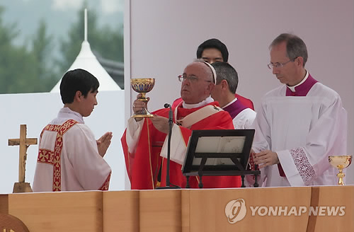 | △ 지난해 8월 16일 광화문 광장에서 프란치스코 교황이 시복식 미사를 집전하고 있다. (연합뉴스 자료사진) |