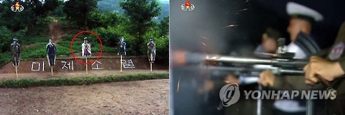 | △ 북한군, 박근혜 대통령 사진 과녁 만들어 실탄 사격 (서울=연합뉴스) 북한 조선중앙TV가 12일 오후 방영한 '조선인민군 군인들 신천박물관 참관·복수 결의모임 진행' 소식 영상에는 북한 군인들의 실탄 사격에 등장하는 과녁 중 정중앙에 박근혜 대통령의 사진이 붙은 것이 확인된다. 박 대통령의 양 옆에 있는 과녁 4인의 사진은 우리 정부의 핵심 인사들로 추정되나 누구인지 식별하기 어렵다. 2015. 8. 13 nkphoto@yna.co.kr |