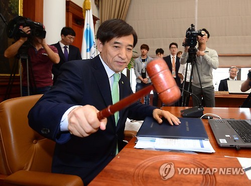 | △ 의사봉 두드리는 이주열 총재 (서울=연합뉴스) 박동주 기자 = 이주열 한국은행 총재가 13일 오전 서울 중구 소공동 한국은행 본점에서 열린 금융통화위원회 본회의에서 의사봉을 두드리고 있다. |