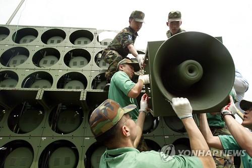 | △ 남북장성급군사회담 부속합의서에 따라 2004년 6월16일 서부전선 무력부대 오두산전망대에서 군인들이 대북선전용 대형확성기를 철거하는 모습(연합뉴스 자료사진) |