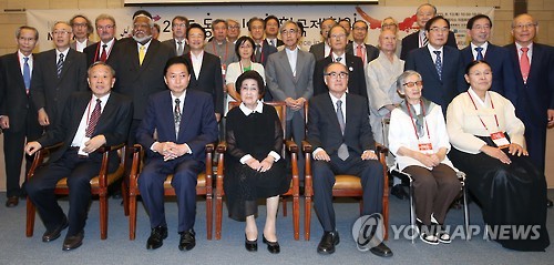 | △ 2015 동아시아평화국제회의 (서울=연합뉴스) 한종찬 기자 = 13일 오전 서울 대한상공회의소에서 열린 '2015 동아시아평화국제회의'에서 참석자들이 기념촬영을 하고 있다. 앞줄 왼쪽 두번째부터 하토야마 유키오 전 일본 총리, 이희호 김대중평화센터 이사장, 동아시아평화 국제회의 대표인 이홍구 전 총리. 2015.8.13 saba@yna.co.kr |