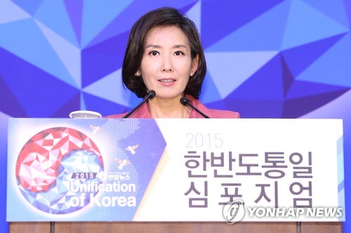 | △ 주제발표 하는 나경원 국회 외교통일위원장 (서울=연합뉴스) 임헌정 기자 = 광복 70주년을 맞아 13일 오전 서울 중구 웨스틴조선호텔에서 열린 '2015 한반도통일 심포지엄'에서 나경원 국회 외교통일위원장이 주제발표를 하고 있다. |