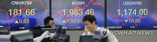| △ '위안화 충격' 완화 (서울=연합뉴스) 황광모 기자 = 중국의 위안화 평가절하가 사흘째 이어진 13일 오후 서울 명동 외환은행 딜링룸 전광판에 이날 원·위안화 환율과 코스피, 원·달러 환율이 표시 돼 있다. 이날 코스피는 13일 사흘 연속 이어진 위안화 평가절하 충격을 딛고 반등에 성공해 7.99포인트(0.40%) 오른 1,983.46으로 마감했다. hkmpooh@yna.co.kr |