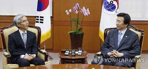 | △ 윤병세 외교장관, 이와타니 시게오 한일중 협력 사무총장 접견 (서울=연합뉴스) 황광모 기자 = 윤병세 외교부 장관(오른쪽)이 13일 오후 서울 도렴동 외교부 청사에서 이와타니 시게오 한일중 3국협력 사무국 사무총장과 환담하고 있다. |