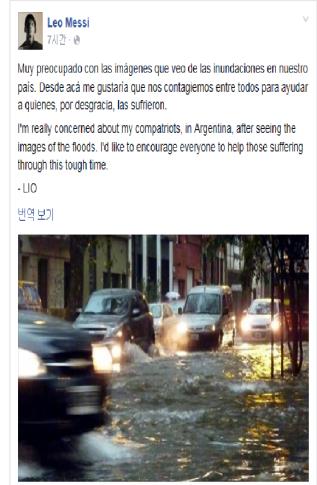 메시는 14일(한국시간) 자신의 페이스북을 통해 "아르헨티나의 홍수사진을 보니 동포들이 많이 걱정된다"면서 "모두가 힘든 시기에 고통받고 있는 분들을 도와주시길 촉구한다"고 밝혔다.