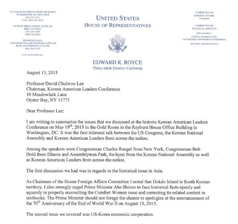 로이스 위원장은 이 문서에서 1회 재미한인지도자대회가 미국 의회, 대한민국 국회, 재미 한인 지도자 등 3자 회의로 진행됐다는 내용을 기술한 뒤 "하원 외교 위원장으로서 나는 독도가 한국 영토라고 언급했다"(As Chairman of the House Foreign Affairs Committee I noted that Dokdo Island is South Korean territory.)고 적었다.