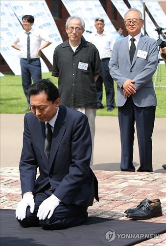 | △ 2015년 8월 12일 오후 한국을 찾은 하토야마 유키오(鳩山由紀夫) 전 일본 총리가 서울 서대문형무소를 방문해 추모비 앞에서 무릎을 꿇고 있다. 14일 발표한 담화에서 사죄의 숙명에서 벗어날 필요가 있다고 한 아베 신조 총리의 발언과 극명한 대비를 이룬다. |