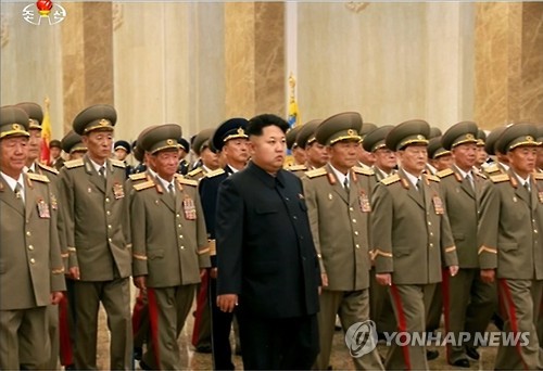 | △ 북한 김정은, 광복 70주년 맞아 금수산태양궁전 참배 (서울=연합뉴스) 김정은 북한 국방위원회 제1위원장이 광복 70주년인 15일 0시(남한이 표준시로 사용하는 동경시 기준 0시 30분) 인민군 간부들과 함께 김일성 주석과 김정일 국방위원장의 시신이 안치된 금수산태양궁전을 참배했다고 조선중앙통신이 보도했다. 사진은 조선중앙TV에 등장한 김정은 제1위원장의 참배 모습. 2015.8.15 nkphoto@yna.co.kr |