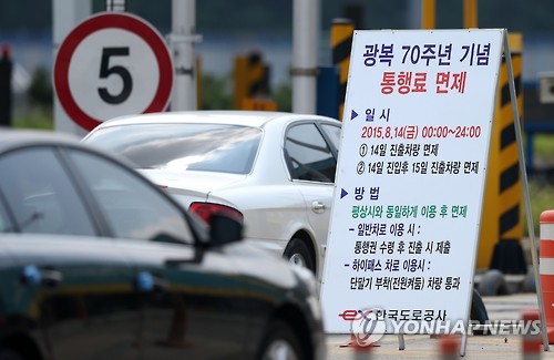 (세종=연합뉴스) 성혜미 기자 = 광복 70주년을 맞아 임시휴일로 지정된 14일 하루 동안 전국 주요 고속도로를 이용한 차량은 약 505만대, 면제된 통행료는 141억원에 이르는 것으로 잠정 집계됐다.
