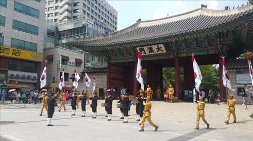 서울시는 14일부터 16일까지 덕수궁 수문장 교대의식에 참여하는 수문장들이 평소 입던 조선시대 중·후기 복장이 아닌 광복군 사병 군복을 입고 특별한 모습을 선보인다고 15일 밝혔다.
