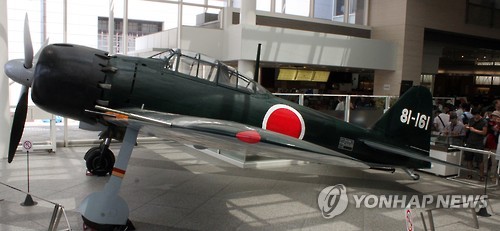 | △ 15일 일본 도쿄도 지요다(千代田)구 소재 야스쿠니(靖國)신사의 전쟁박물관인 유슈칸(遊就館) 내 '영식함상전투기'(零式艦上戰鬪機, 일명 제로센<ゼロ戰, 零戰>) 주변에 관람객이 모여 있다. 이 전투기는 2차 대전 말기에 특공대의 자살 공격에 사용된 기종이다. |