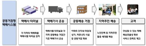 기본 형태는 국내 17개 택배사들이 지정된 '배송거점'까지 물건을 운반하고 거점부터 각 개인으로의 배달은 1개 택배사에 맡기거나, 마을 노인·이장 등 해당 지역 인력을 활용하는 것이다.