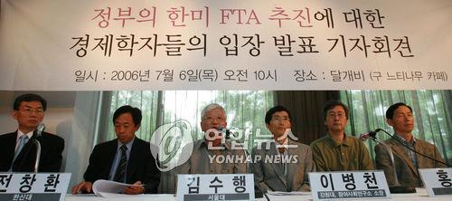 | △ 2006년 정부의 한미FTA 추진에 대한 입장을 발표하는 고 김수행 교수 |