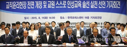 | △ (서울=연합뉴스) 황광모 기자 = 한국교원단체총연합회(교총)와 17개 시·도 교원단체총연합회, 한국초·중·고교장연합회 등 교원단체가 11일 오후 서울 태평로 프레스센터에서 열린 기자회견에서 최근 발생한 교사 연쇄 성추행 파문과 관련해 대국민 사과를 하고 있다. 이날 회견에서 교원단체 회원들은 "철저한 자성을 통해 환골탈태 노력하겠다" 교직윤리헌장 전면개정 착수를 발표했다. 2015.8.11 hkmpooh@yna.co.kr |