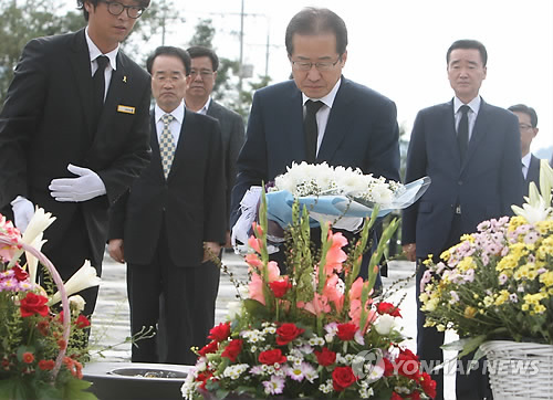 | △ 홍준표 경남도지사가 지난해 9월 2일 경남 김해시 진영읍 본산리 봉하마을을 찾아 노무현 전 대통령 묘역에 참배하고 있다. (연합뉴스 자료사진) |