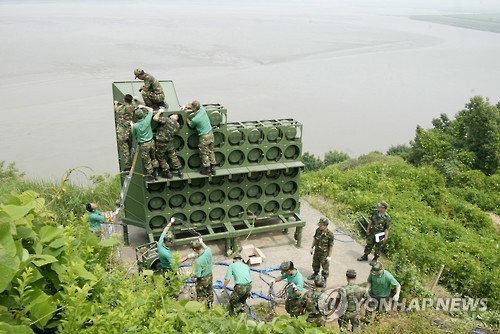 | △ 국방부, 대북 확성기 방송 재개 (서울=연합뉴스) 군 당국이 북한군의 비무장지대(DMZ)에 의도적으로 목함지뢰를 매설한 행위에 대한 응징 차원에서 경기도 파주 인근에서 대북 확성기 방송을 일부 시행했다고 10일 밝혔다. 대북 확성기 방송은 이번 목함지뢰가 매설된 파주 1사단과 중부 지역 등 2곳에서 실시할 계획이다. 대북 확성기 방송 재개는 11년만 이다. 남북장성급군사회담 부속합의서에 따라 2004년 6월16일 서부전선 무력부대 오두산전망대에서 군인들이 대북선전용 대형확성기를 철거하고 있다. 2015.8.10 << 연합뉴스 DB >> photo@yna.co.kr |