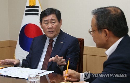 | △ 최경환 부총리 인터뷰 (서울=연합뉴스) 김주성 기자 = 최경환 경제부총리 겸 기획재정부 장관(왼쪽)이 지난 12일 서울 세종로 정부 서울청사 집무실에서 노동시장 구조개혁, 청년 일자리 창출 등 현안에 대해 이창섭 연합뉴스 편집국장과 인터뷰하고 있다. |
